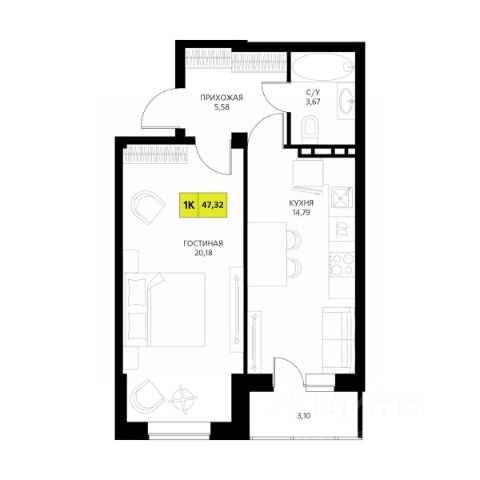 Продается 1 комнатная квартира площадью 47.72 в жилом комплексе с инфраструктурой бизнес-класса Новая История в Дербенте, микрорайон Южный.
