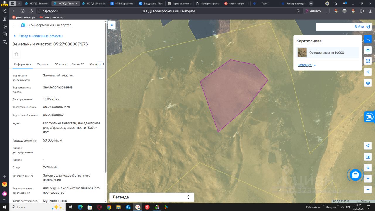 Земельный участок с кадастровым номером 05:27:000067:676 площадь 50000 кв. м. категория -земли сельскохозяйственного назначения, вид разрещенного использования для сельскохозяйственного производства, месторасположения РД, Дахадаевский район, с. Уркарах, местность "Каба-даг".
