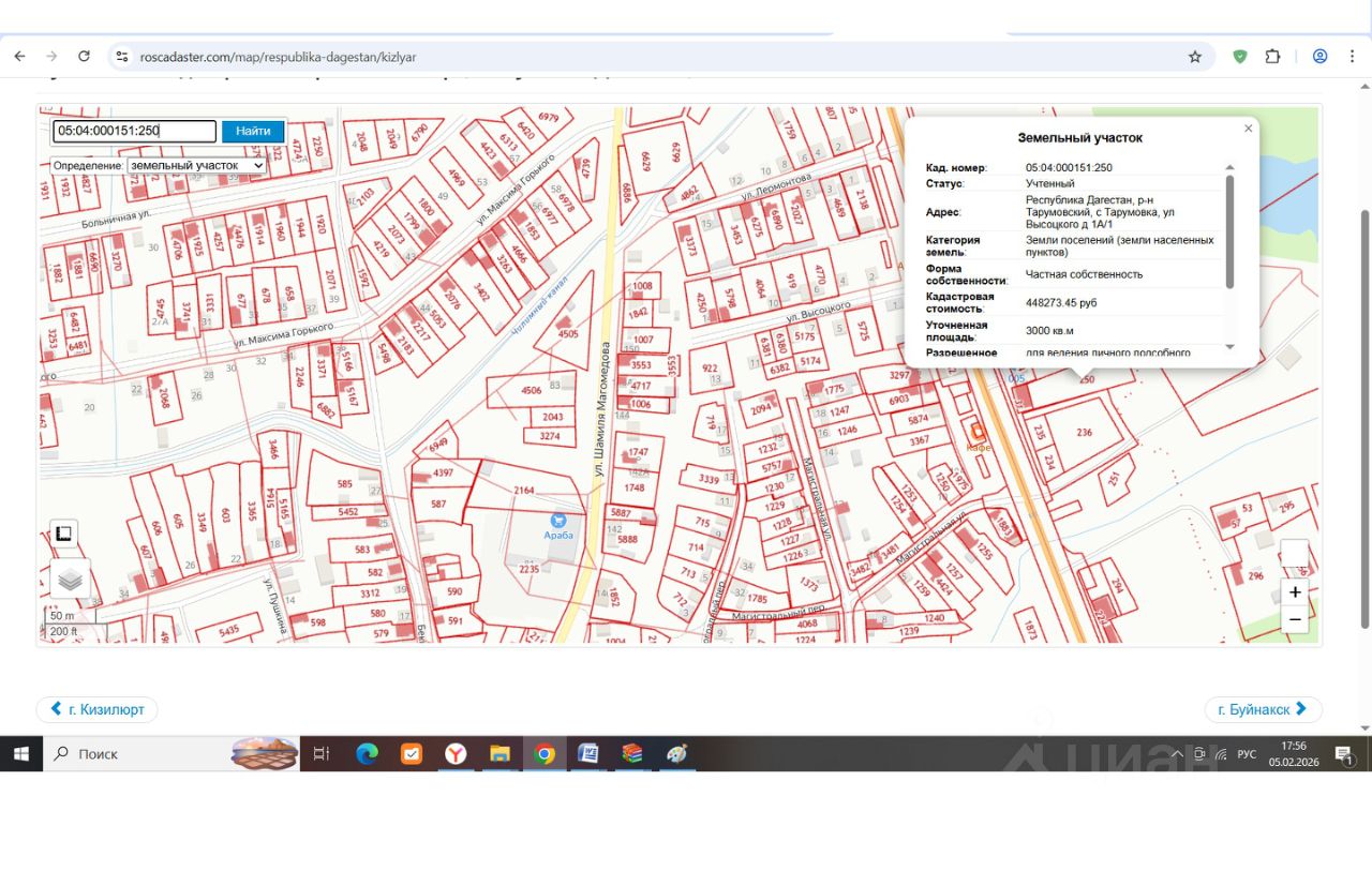Земельный участок с кадастровым номером 05:04:000151:250, расположенный по адресу: РД, Тарумовский район, с. Тарумовка, ул. Высоцкого, 1а/1. Категория земель: земли населенных пунктов. Площадь земельного участка 3000 кв.м. Вид разрешенного использования: для ведения личного подсобного хозяйства. Вид права - аренда. Срок аренды - 20 лет.