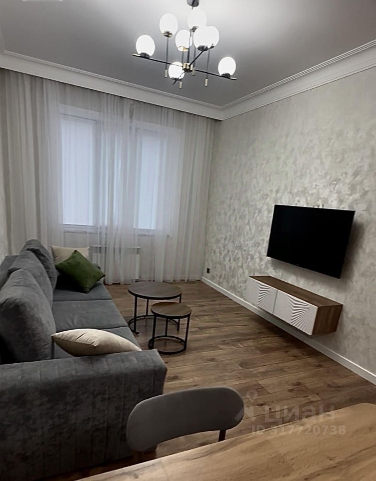 В гостиной есть раскладной диван ( который позволяет 2 спальных места) телевизор , тумба ,письменный стол .