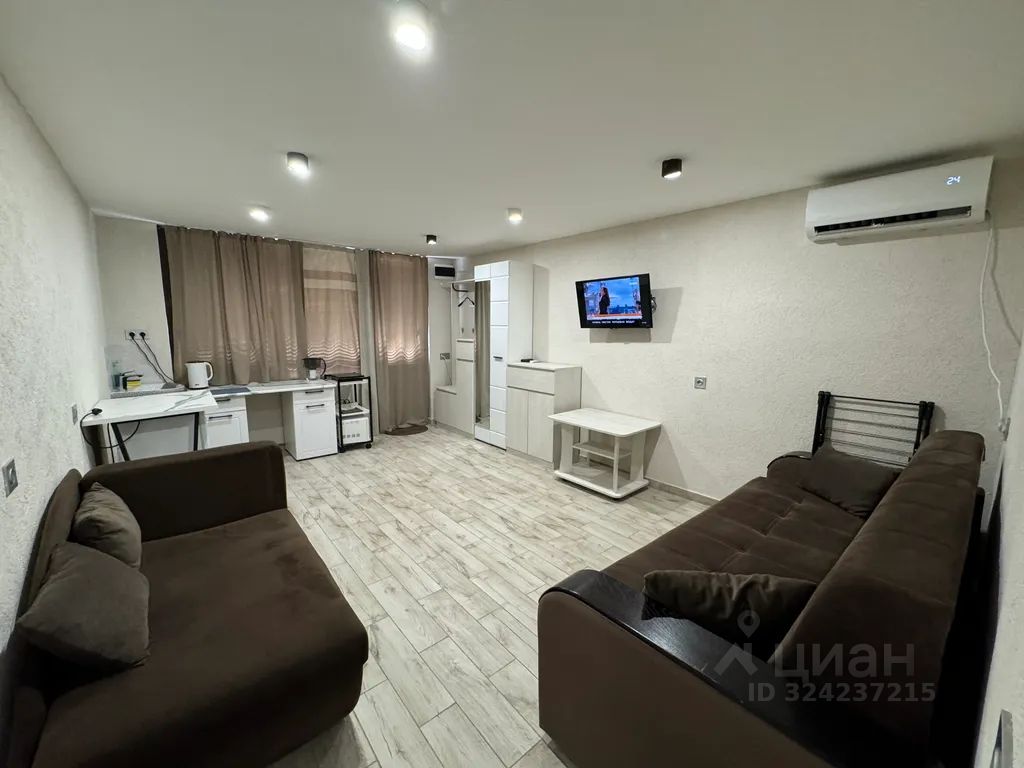 Студия чистая, уютная, есть всё необходимое для проживания. Холодильник, кондиционер, микроволновка, электрочайник, электропечь. Телевизор +ТриколорТВ. Wi-Fi интернет. Утюг, фен для волос.