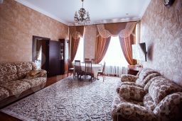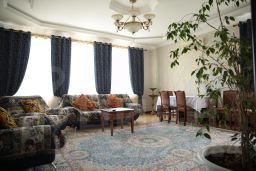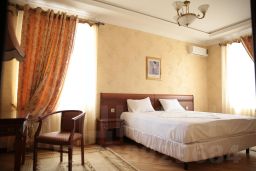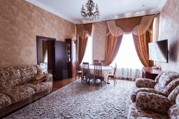 В номере присутствует: большая кровати, деван, два кресла, журнальныйс столик, обеденный стол со стульями, сеиф, два кондиционера, мини бар, большой телевизор со спутниковым телевидением, писменный стол, индивидуальные средства гигиены, фен, ванная, горячая холодная вода постоянно