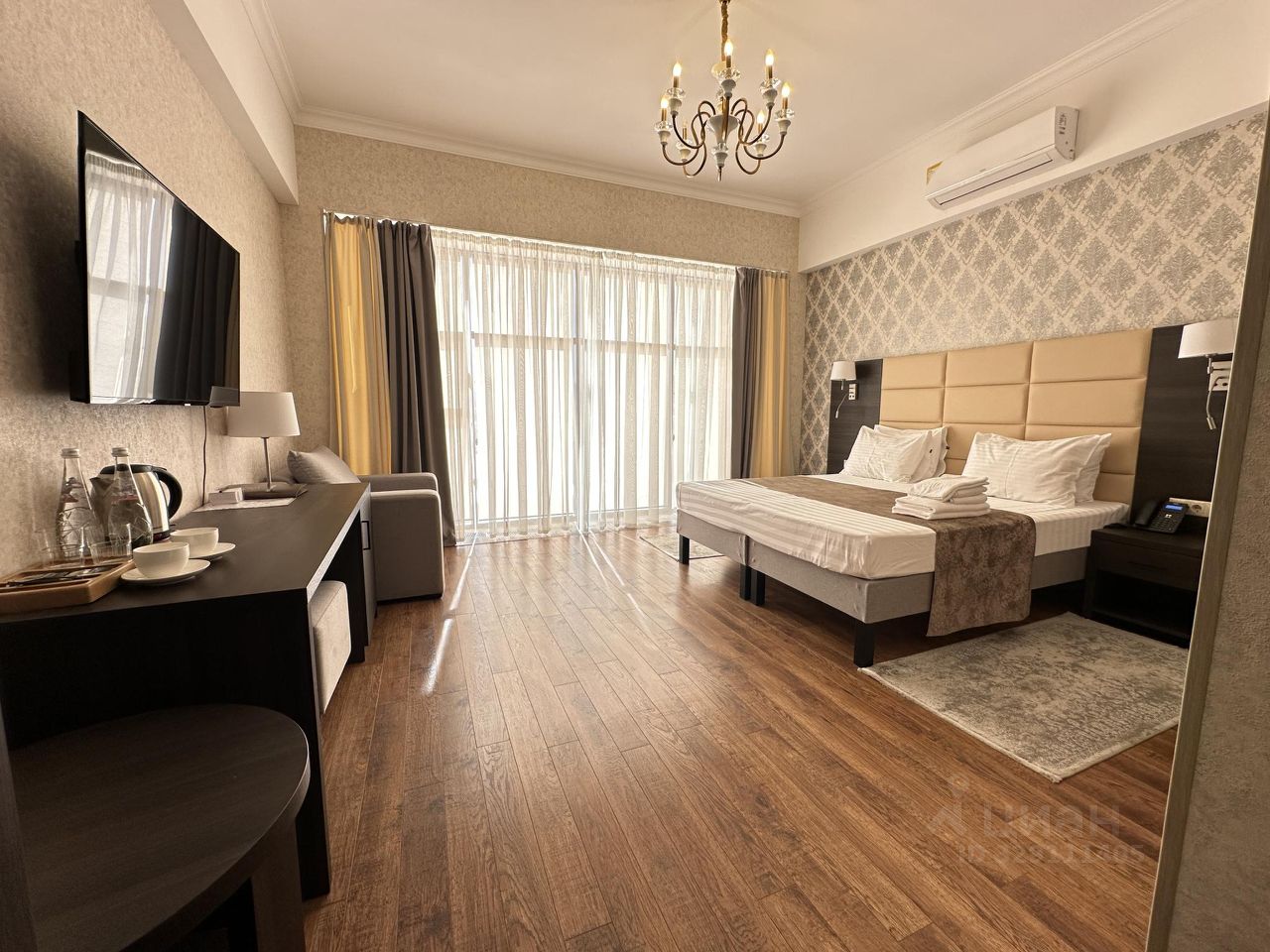 Номер категории "Комфорт" - просторный однокомнатный современный номер с панорамными окнами и со всеми необходимыми удобствами. В номере совмещена просторная рабочая зона, место отдыха и спальное место.