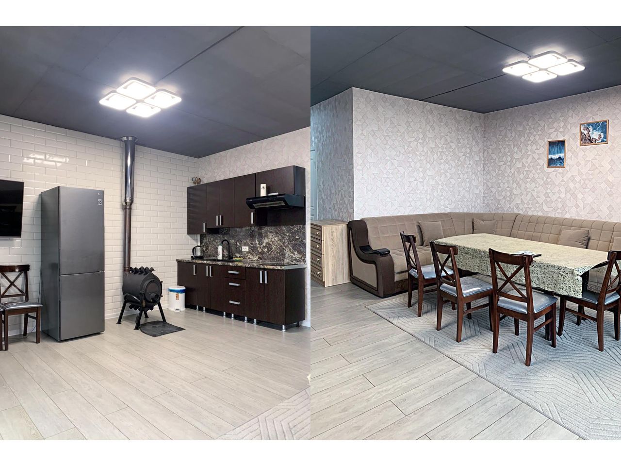 Просторная кухня-гостиная 30 кв.м, smart телевизор, большой угловой диван, обеденный стол, кухня с плитой, холодильником и необходимой посудой