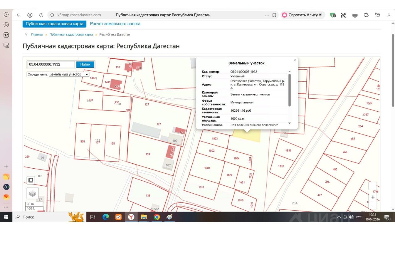 Земельный участок с кадастровым номером 05:04:000006:1932, расположенный по адресу: РД, Тарумовский район, с. Калиновка, ул. Советская, 118-а. Категория земель: земли населенных пунктов. Площадь земельного участка 1000 кв.м. Вид разрешенного использования: для ведения личного подсобного хозяйства. Вид права - купля-продажа (собственность).