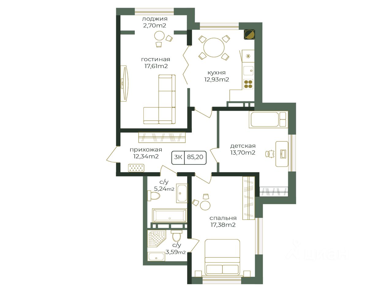 Квартира с продуманной функциональной планировкой, позволяющей организовать три отдельные комнаты под разные сценарии жизни: спальни, кабинет, детскую или гостиную зону.
