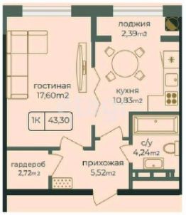 Общая площадь43,3 м²