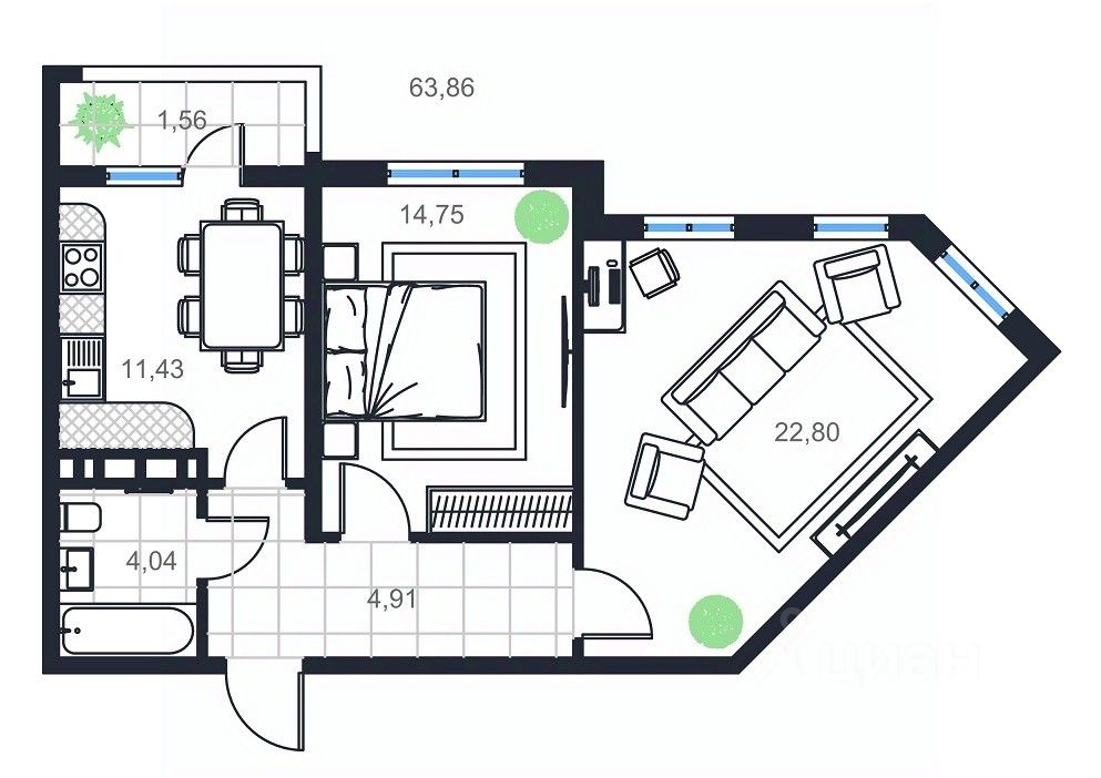 Продаётся 2-комнатная квартира в строящемся доме (Дом 1), срок сдачи: III-кв. 2026, общей площадью 63.86 кв.м., на 7 этаже.
