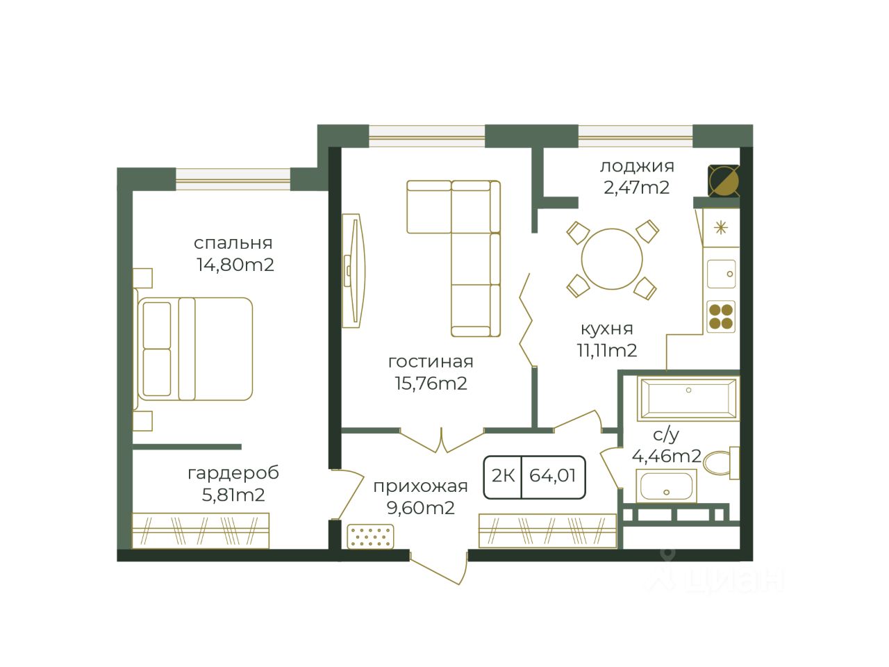 Общая площадь64,01 м²