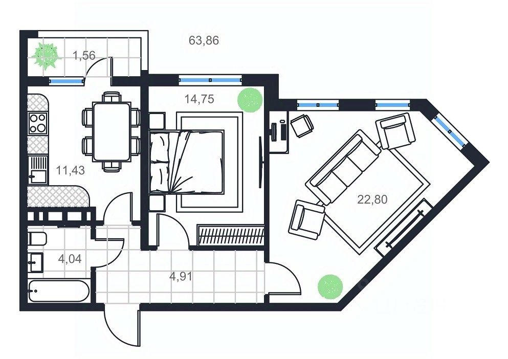 Продаётся 2-комнатная квартира в строящемся доме (Дом 1), срок сдачи: III-кв. 2026, общей площадью 63.86 кв.м., на 15 этаже.