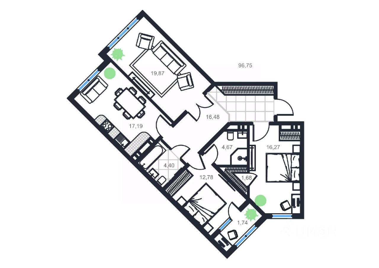 Продаётся 3-комнатная квартира в строящемся доме (Дом 1), срок сдачи: III-кв. 2026, общей площадью 96.75 кв.м., на 14 этаже.