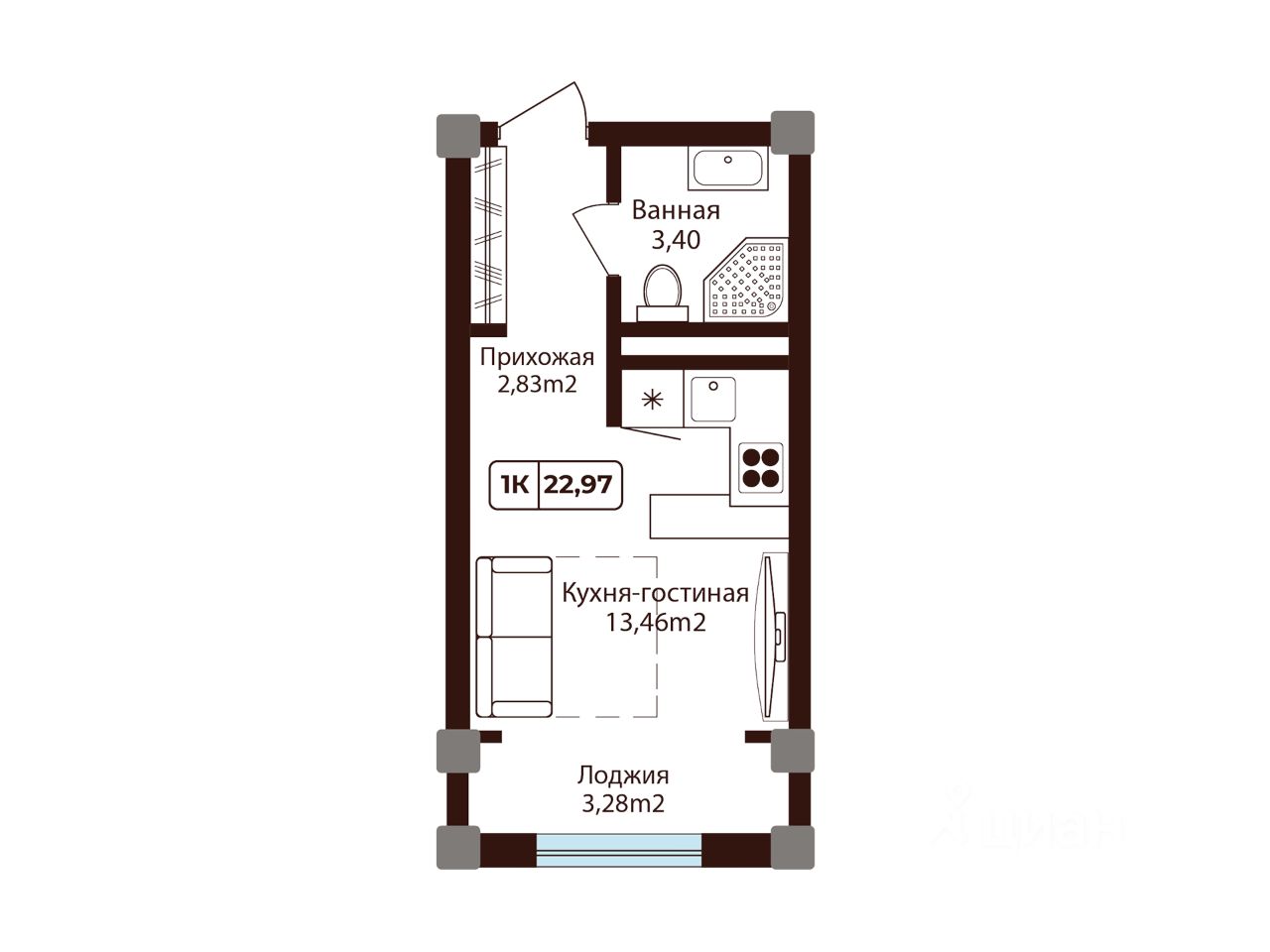 Общая площадь22,97 м²