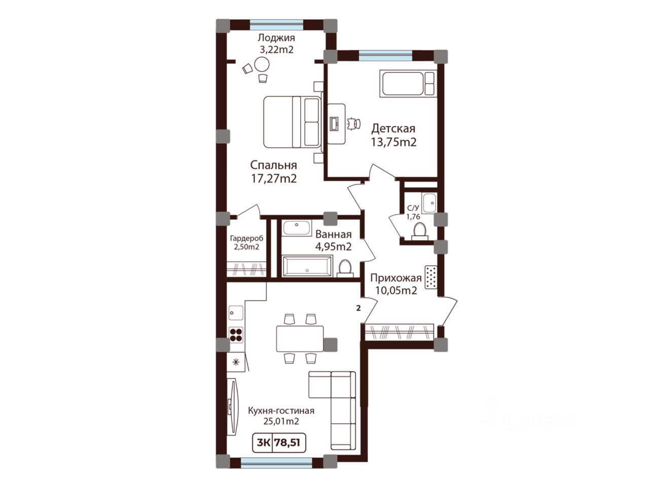 Общая площадь78,51 м²
