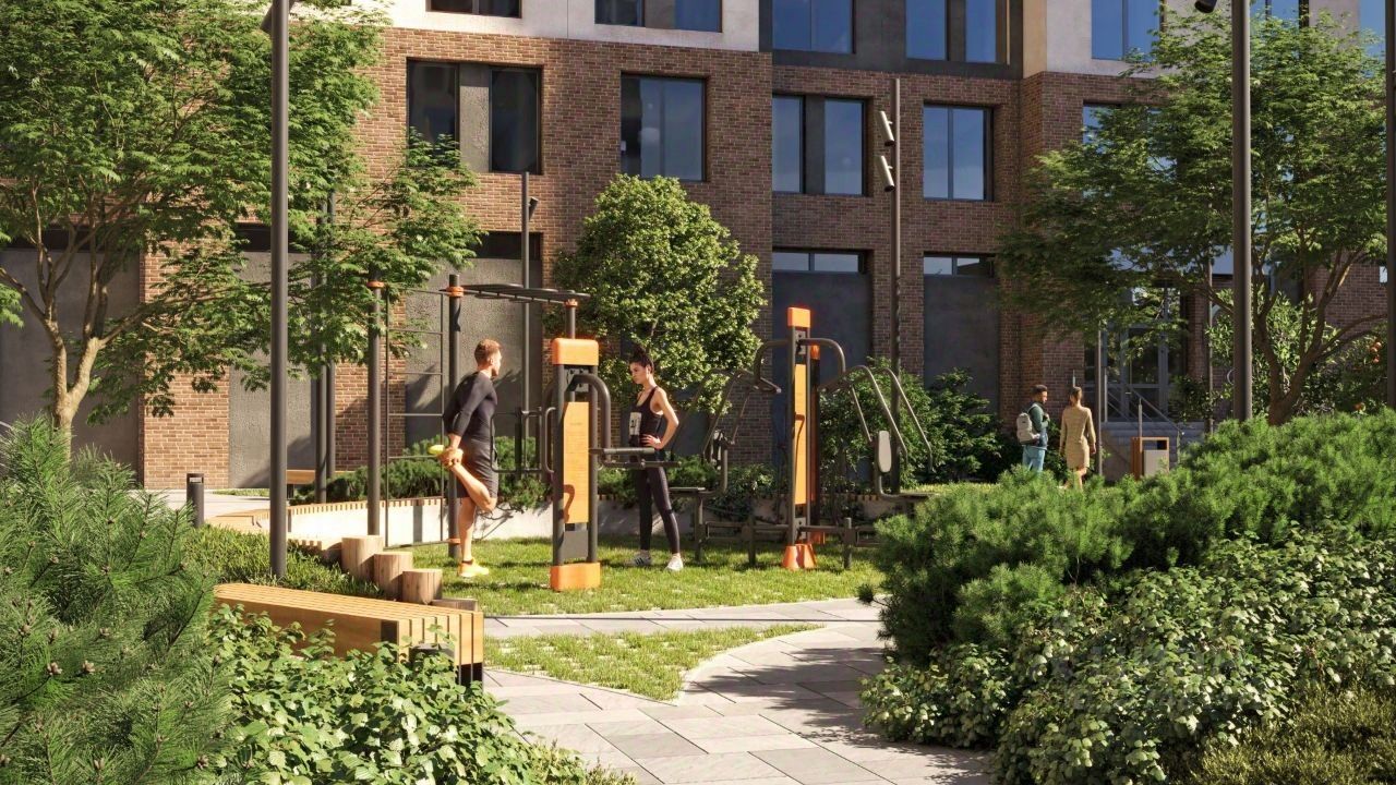 Прогулочные зоны на территории ЖК, покрытые брусчаткой.