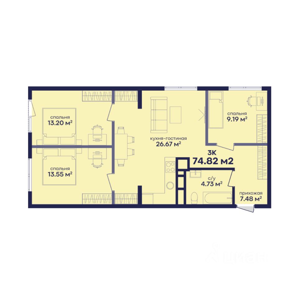 Общая площадь74,82 м²