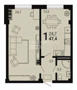 Современная 1-комнатная квартира площадью 47,4 кв. метра в новом монолитном доме, расположенном на 3-м этаже 5-этажного дома.