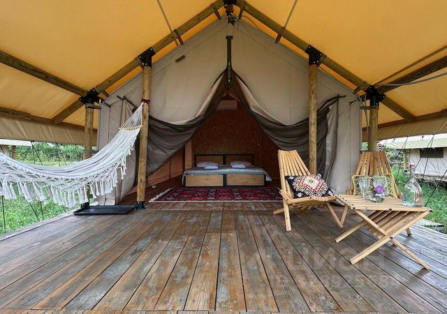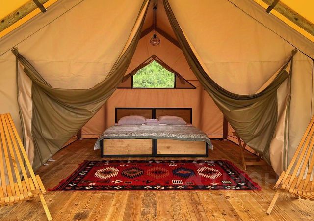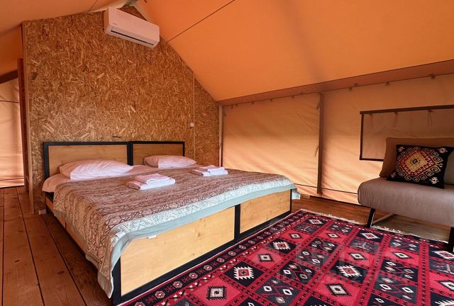 Caspian Camp — место для вдохновения и единения с горами В зеленой долине возле горной речки стоит маленькое (небольшое) село Аймаумахи, расположенное в 100 км от Махачкалы на высоте 1150 метров над уровнем моря. Caspian Camp равноудален от самых популярных достопримечательностей Дагестана — аул-призрак Гуниб и Сталинский водопад, село-ремесленников Кубачи и самым древнем городом России Дербент. Но особое устройство комплекса, атмосфера и виды заставят вас возвращаться сюда после коротких поездок по окрестностям. Жить на земле, чувствовать ее и взаимодействовать с ней — сегодня настоящая роскошь и привилегия, особенно после многоэтажных офисов в мегаполисах БЕЗКОНЕЧНЫХ ПРОБКАХ, негаснущих огней больших городов. Искусно организованное пространство с отдельно стоящими глэмпингами дает одновременно и нужное чувство уединенности, ценное для момента отдыха, и ощущение пребывания в "своей" компании. Все бунгало расположены так, чтобы их террасы были видовыми и гости могли наслаждаться природой без помех. Может ли быть неудачным день, когда первое, что ты видишь, это живописные горы и бескрайная долина, откуда ветер приносит АРОМАТЫ цветов и трав. В интерьере мы стремимся к естественности, чтобы гости ощущали близость к природе. Используем природные цвета, мебель из натурального дерева, элементы ручной работы. На большой территории всего 5 бунгало. На холме пространства место встреч и кафе; от него, словно лучи, расходятся дорожки к костровой и шатрам-тентам. Отпусти себя в горы! Глэмпинг с большой двуспальной кроватью 160x200 или двумя раздельными кроватями 80x200. Кресло-кровать раскладывается в дополнительное спальное место 80x200. Санблок с душевой кабиной в отдельном здание, при заселение дается ключ от персонального блока. Завтрак включен