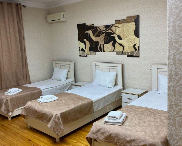 Отель Арбат расположен в центре города Дербент, а если быть точнее, то по адресу: ул. 345 Дагестанской Стрелковой Дивизии, 6м. До основных достопримечательностей несколько минут езды. В шаговой доступности находится новый культурный объект- самый большой мультимедийный фонтан в России. Побережье Каспийского моря всего в нескольких минутах ходьбы, а точнее- 693 метра. Расстояние до аэропорта составляет - 160 км. По запросу гости могут воспользоваться трансфером. В распоряжении гостей 17 номеров категории Эконом, Стандарт, Комфорт и Люкс. Все номера оборудованы необходимой мебелью и техникой для временного проживания. Имеются средства личной гигиены, набор полотенец и комплект постельного белья. Для гостей, путешествующих на автомобиле, предусмотрена бесплатная парковка, которая предназначена и для грузового транспорта. Также рядом с отелем есть остановка общественного транспорта. На территории отеля предоставляется Wi-Fi. К услугам гостей работает круглосуточная стойка регистрации, экскурсионное бюро отеля. В предоставляемый гостям сервис входит : химчистка, прачечная, обслуживание номеров, ускоренная регистрация заезда и выезда. На первом этаже работает ресторан, где подают блюда кавказской кухни. Есть круглосуточная аптека. А также бар, где вы можете приятно провести время. По утрам гостям доступна услуга- Завтрак. Напротив расположены супермаркеты и иные продовольственные магазины. На задней части отеля находится огороженная забором по периметру детская площадка, а также маленькая беседка, где вы можете отдохнуть, пока ваш ребенок играется Номер стандарт с 3 односпальными кроватями. Имеются средства личной гигиены, набор полотенец и комплект постельного белья, телевизор, фен.