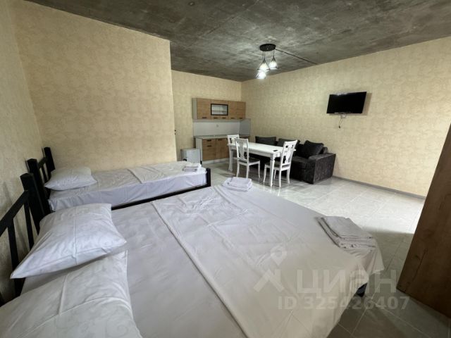 Каждый номер представляет собой студию совмещенная с кухонной зоной, которая оборудована всем необходимым кухонным инвентарем, площадь же составляет тридцать пять квадратных метров, в которой имеется спальная зона на трех гостей (одна односпальная кровать и одна двух спальная кровать) и санузел с душевой, так же расположен раскладной большой диван что позволит разместить у нас до 5 гостей. Еще к вашему вниманию все оконные проемы дооборудованы плотными шторами что даст вам отдохнуть в дневное время суток после дальней поездки или после отдыха на море. В общем каждый номер вмещает до пяти гостей, а таких номеров напомню вам у нас шесть. Так же у нас вы можете отдыхать с домашними животными, только порядок вы должны соблюдать за ними сами.