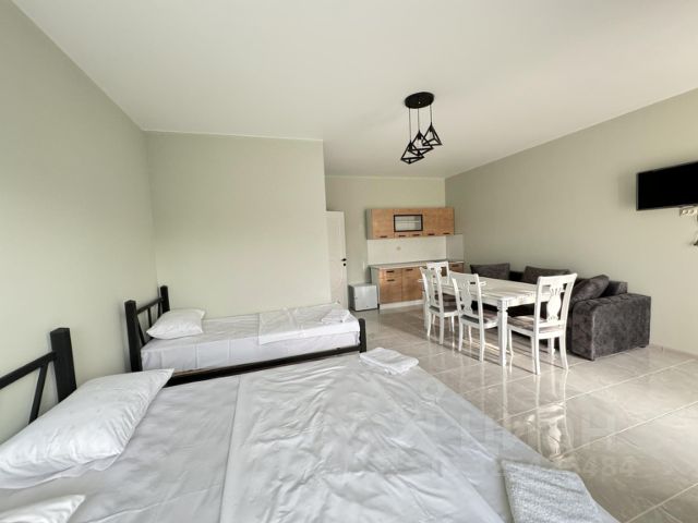 Каждый номер представляет собой студию совмещенная с кухонной зоной, которая оборудована всем необходимым кухонным инвентарем, площадь же составляет тридцать пять квадратных метров, в которой имеется спальная зона на трех гостей (одна односпальная кровать и одна двух спальная кровать) и санузел с душевой, так же расположен раскладной большой диван что позволит разместить у нас до 5 гостей. Еще к вашему вниманию все оконные проемы дооборудованы плотными шторами что даст вам отдохнуть в дневное время суток после дальней поездки или после отдыха на море. В общем каждый номер вмещает до пяти гостей, а таких номеров напомню вам у нас шесть. Так же у нас вы можете отдыхать с домашними животными, только порядок вы должны соблюдать за ними сами.