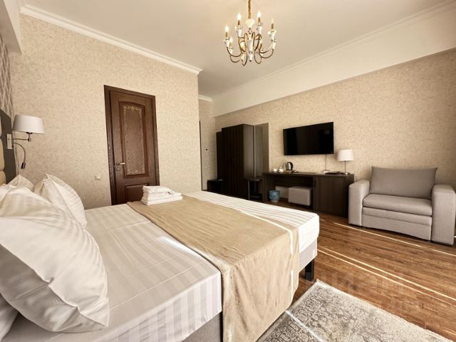 Номер "Люкс" - это просторный двухкомнатный номер который оформлен в современном стиле, интерьер выполнен в светлых тонах со всем необходимым оборудованием для комфортного пребывания гостей. Номер состоит их двух комнат с межкомнатной дверью и одной ванной комнаты, специально оборудован для комфортного проживания всей семьи или маленькой компании. Также в номере вы найдете все необходимые удобства для приятного пребывания, что позволит каждому члену семьи чувствовать себя как дома. Дети до 3 лет размещаются бесплатно без предоставления места. По желанию гостя большую кровать "King Size" можно легко превратить в 2 односпальные кровати. Кровати имеют классные ортопедические матрасы 1000 пружин на спальное место, 2 вида подушек и одеял. Анатомическая подушка "memory foam" с одной стороны имеет гель для охлаждения, принимает форму головы и избавляет от головных болей и боли в шее при остеохондрозе. Хрустящие белоснежные простыни из премиального сатина и мягкие одеяла создают великолепное ощущение премиального комфорта. Благодаря этому гости могут быстро погрузиться в глубокий сон и отдохнуть после экскурсий или тяжелого трудового дня. Для принятия душа гостям предлагается комфортный санузел со встроенной современной сантехникой, безопасными стеклянными душевыми перегородками, тропический, обычный, и гигиенический теплый души. Мягкие махровые тапочки, халаты, большие пушистые полотенца, шампунь, гель для душа, бальзам кондиционер, мощный фен и гигиенический набор. В номере также есть шкаф, холодильник, чайник и 2 огромных Смарт телевизора 75 дюймов с QLED матрицей и 4к изображением. Скоростной 5G WiFi c VPN позволяет гостям заходить в Ютуб и другие приложения, как с телевизора так и с телефона. В гостиной есть раскладной 2х-местный диван, на котором могут расположиться 2 взрослых, либо трое детей. Большой журнальный стол позволит гостям насладиться семейным или романтическим ужином. Панорамные окна с видом на парк закрываются высококачественными шторами "блэкаут" на электрокарнизе, что дает вам возможность выспаться даже днем и защитится от палящего солнца летом, наслаждаясь прохладой бесшумных кондиционеров. Приятного отдыха!